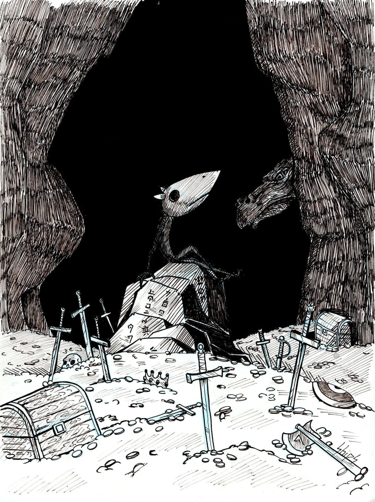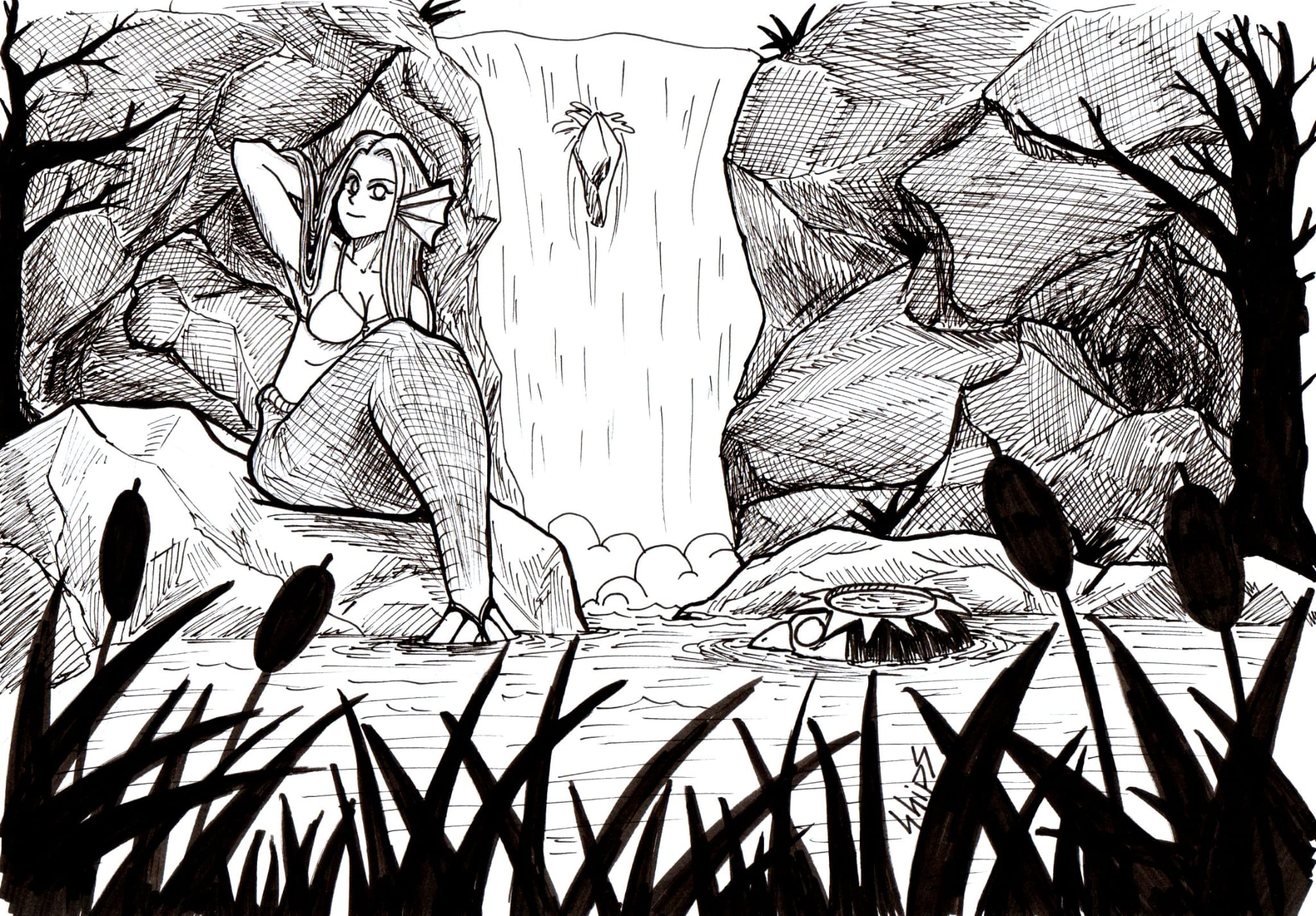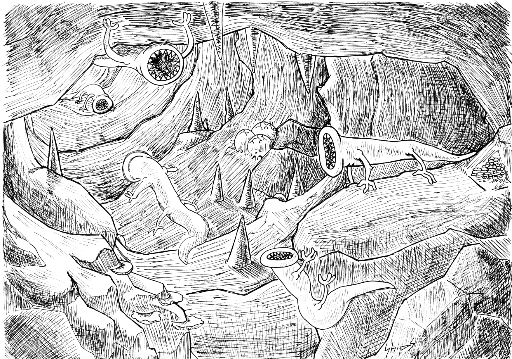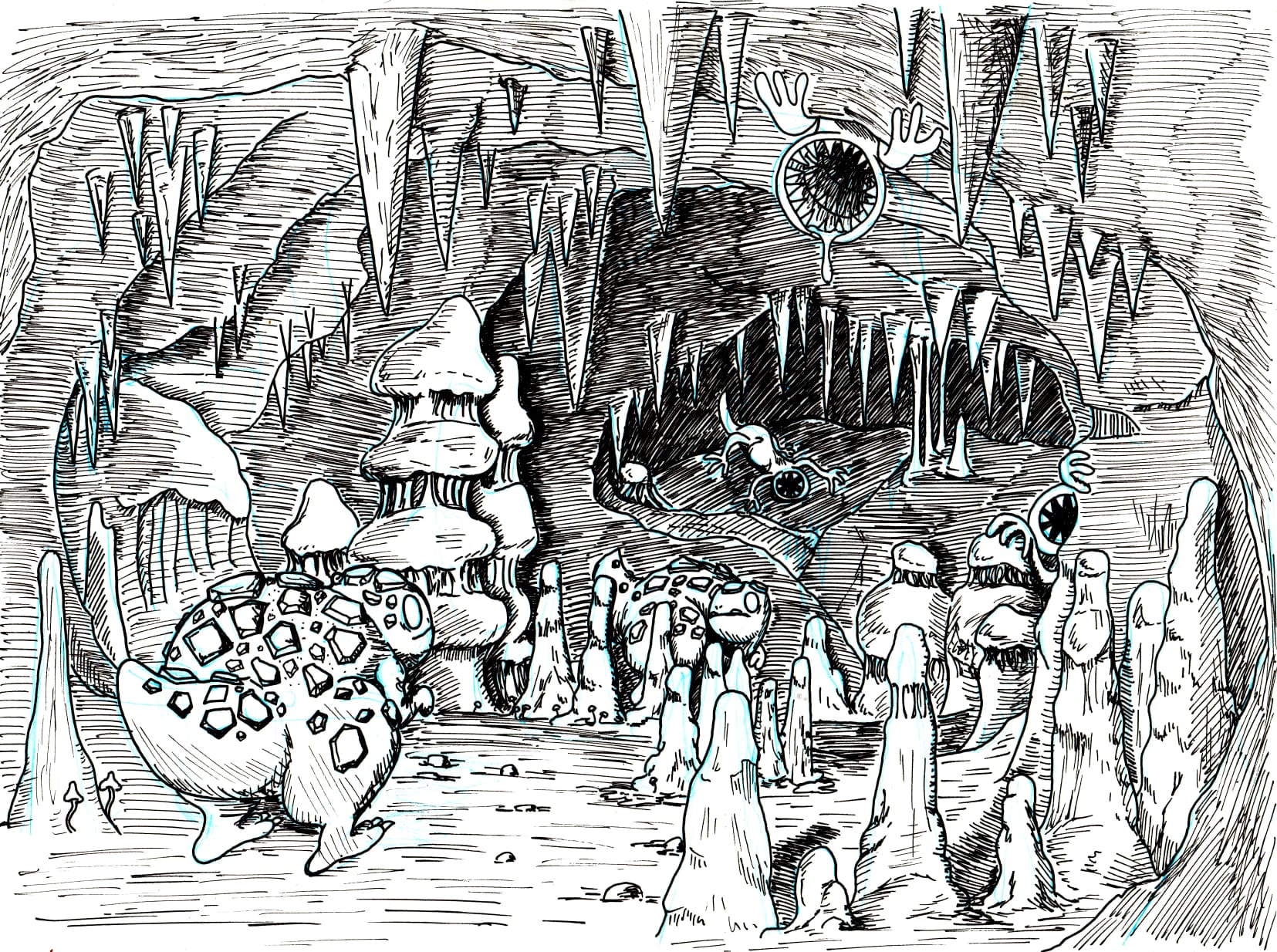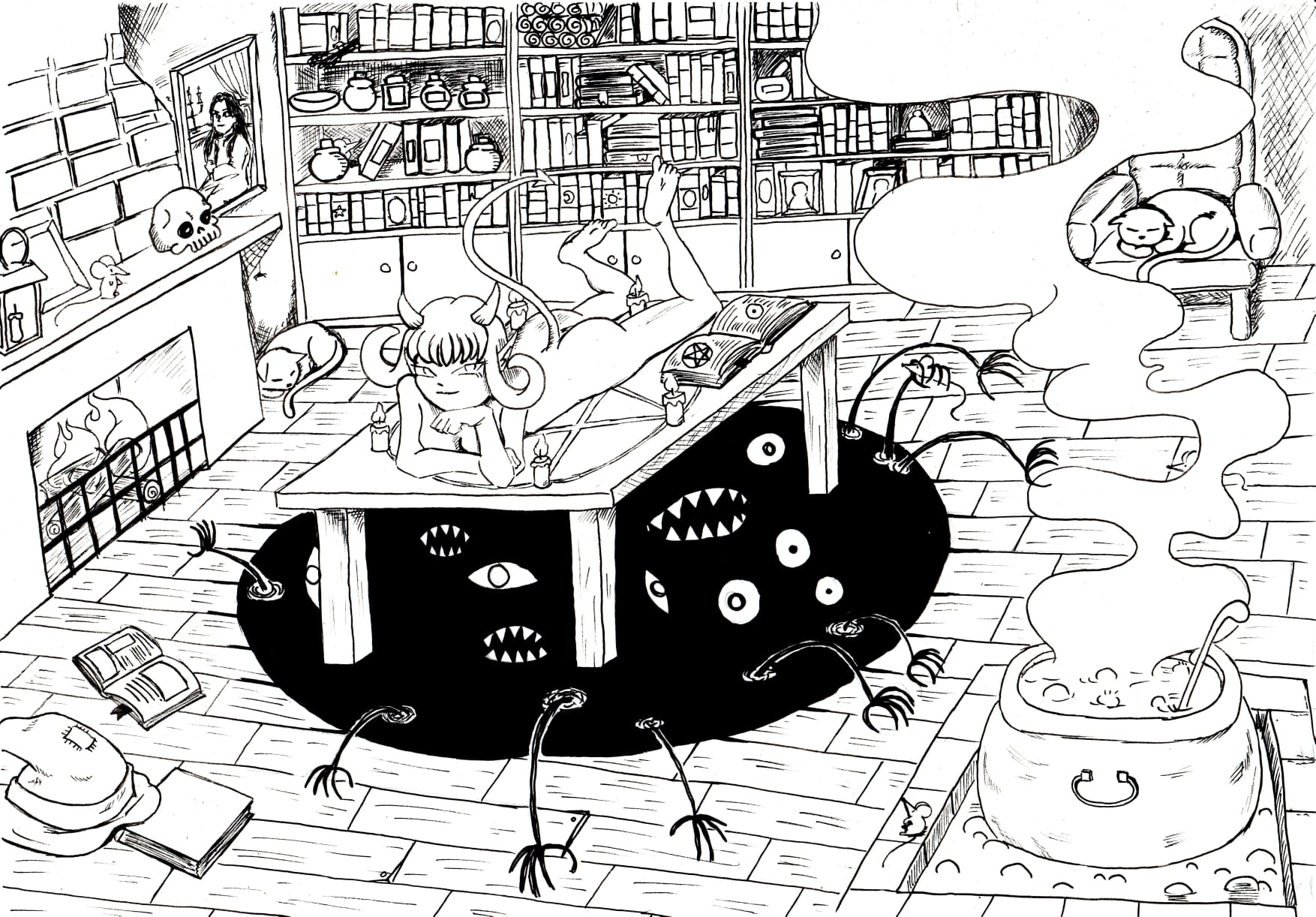 Fidèle au dessin sur papier, Alexandre travaille principalement au crayon et aux liners fins, privilégiant le geste manuel et la spontanéité.